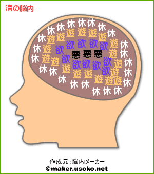 脳内見てみました 2007年07月24日 20:52 ←今話題のアレをやってみました。 うん・・・こんなもんだと思う・・・。 とにかくいっつも休む事ばっかり考えてたり、核の部分に悪が潜んでる辺り。 興味のある人はやってみて下さい。 名前を入力するだけで、あなたの脳内が見えてきます。 ここからどうぞ→脳内 「暇つぶししてみる」カテゴリの最新記事 < 前の記事次の記事 > コメント コメント一覧 (2) 1. 件河童 2007年07月26日 21:39 脳の外郭が「悩」で、中央にポツンと「H」の文字<br> 脳の外郭が「悩」で、中央にポツンと「H」の文字<br> リアルにへこみました。 0 キヨ がしました 2. 清 2007年07月26日 23:26 件河童 さん、こんばんわ!<br> 件河童 さん、こんばんわ!<br> おお!脳内見たんですね!?「悩」と「H」ですか・・・。(笑)<br> もの凄くHについて悩んでるのでしょうか。<br> それとも、いっつも何かに悩まされてるのに、ふと何かの瞬間にHな事が頭をかすめるのか・・・。<br> 何だかいろんな捉え方ができて面白いですよね、コレ。 0 キヨ がしました コメントフォーム 名前 コメント 記事の評価 リセット リセット 顔 星 情報を記憶 コメントを投稿する