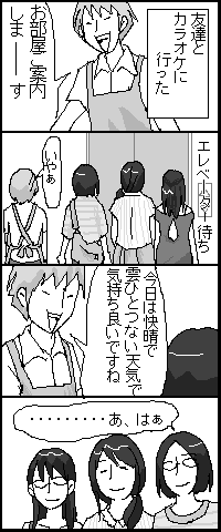 本当は「だから?」って言いたかった(笑) 2007年07月29日 01:06 専門学校時代の仲間達とカラオケに行ってまいりました。 で、そこの店員さんが気さくな人で突然話し掛けてきたんですが、なんの心の準備もしてなかった私は3秒くらい黙ってしまいました。(笑) それにしても久しぶりに3人でもカラオケ、楽しかったです。 あの部屋のクーラー、ちょっとキツかったけど。 しかも水漏れまでしてたけど。 「コマまんが」カテゴリの最新記事 < 前の記事次の記事 > コメント コメントフォーム 名前 コメント 記事の評価 リセット リセット 顔 星 情報を記憶 コメントを投稿する