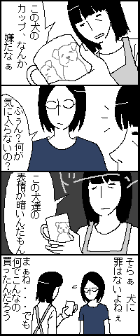 陰気 2007年08月19日 22:56 ←実物。(クリックで大きくなります) 「こっちまで気分が暗くなる」とまで言われてました、この犬達・・・。 自分で買ってきたくせに、ひどい事言うなぁ。 「コマまんが」カテゴリの最新記事 < 前の記事次の記事 > コメント コメント一覧 (3) 1. naococo 2007年08月21日 00:00 (≧Σ≦)ぶっ! たしかに陰気・・・沈んでますね。<br> (≧Σ≦)ぶっ! たしかに陰気・・・沈んでますね。<br> どうしちゃったんでしょう。<br> 私もけっこうそういのに描かれてる顔とか気になります。<br> なんというか、普通の人が作っちゃったようなカップにも見えますね(笑)<br> いや、お母様、買われたんですよね(@゜m゜@)プッ <br> 0 キヨ がしました 2. 超凄腕・としあき 2007年08月22日 01:53 こんばんは。超凄腕・としあきといいます。<br> こんばんは。超凄腕・としあきといいます。<br> としあきと呼んでください。<br> 癒されるブログなので、登録してしまいました。<br> 俺のブログは変なブログですが、<br> お暇があれば来て下さい。<br> 失礼しました。 0 キヨ がしました 3. 清 2007年08月23日 00:35 naococoさん><br> naococoさん><br> ハイ、100円ショップの商品なんで、手作り感いっぱいのマグカップになっております。(笑)<br> 実はこれ、写真には写りきらなかったんですが、コップの裏側にもう2匹、犬が隠れてるんですよ~。<br> 計4匹、そろいもそろって元気ない顔してます。<br> 母さん・・・お店で気付くべきでした。<br> <br> としあきさん><br> なんと!登録してくださったんですかぁ!<br> わー、ありがとうございます。癒されるなんて・・・ちょっと照れますねぇ。<br> あ、実は以前コメントくださった時に、ブログのアドレスも記入して下さってたので<br> 覗きに行かせてもらってたんですよ~。<br> これからも遊びに行くので、よろしくお願いしますね。<br> 0 キヨ がしました コメントフォーム 名前 コメント 記事の評価 リセット リセット 顔 星 情報を記憶 コメントを投稿する