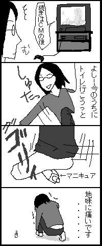 角張ったマニキュアは痛い 2007年10月20日 20:51 この他にもボックスティッシュに足突っ込んだり、プレステのコントローラを踏みつけたりと、足元への注意力が足りないようです。 あと、部屋ももう少し片付けた方が良さそうだ・・・。 「日常」カテゴリの最新記事 < 前の記事次の記事 > コメント コメント一覧 (2) 1. マルゴン 2007年10月24日 01:05 こういうの痛いですよねー<br> こういうの痛いですよねー<br> 自分もよくゲーム機のコントローラーとか踏んでしまうんですが<br> こう、ゴリっといく感じがなんとも<br> 一番痛かったのはお風呂場でせっけん踏んでこけた時が 笑 0 キヨ がしました 2. 清 2007年10月24日 21:03 マルゴンさん><br> マルゴンさん><br> 私はゲームのコントローラーを踏んだ時、自分の足よりコントローラーが壊れてないかの確認が優先になります。(笑)<br> コントローラーに、「大丈夫かっ!?」と声までかける始末です。<br> 風呂場の転倒は危険過ですね。どう転んでも絶対痛そう・・・。 0 キヨ がしました コメントフォーム 名前 コメント 記事の評価 リセット リセット 顔 星 情報を記憶 コメントを投稿する