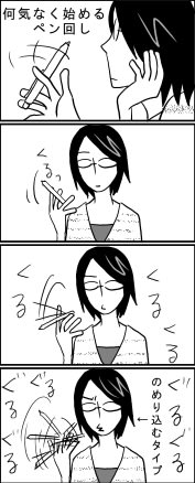 回って回って 2008年05月28日 22:33 仕事中とか絵を描いてるときとか、いつの間にかペン回ししてることがあります。 しかも一生懸命になっちゃって、どんどん一人の世界に入っています。 そういえばこんな事もありました。 「日常」カテゴリの最新記事 < 前の記事次の記事 > コメント コメント一覧 (5) 1. こはく 2008年05月28日 22:57 ペン回し・・・憧れます。<br> ペン回し・・・憧れます。<br> 私はまったく回せません!!<br> なんか、飛んでっちゃう・・・。<br> コツを・・・コツを教えて下さいっ!!<br> 回したいんだ・・・とても、回したいんだ。 0 キヨ がしました 2. 清 2008年05月28日 23:09 こはくさん><br> こはくさん><br> いや、決して回すのが上手いワケじゃないんですけどね。<br> 少し重量感のあるペンだと回しやすいかなぁ。<br> ペン回しのプロみたいに回せたら、気持ち良いんだろうなぁ。 0 キヨ がしました 3. ともっち 2008年05月29日 02:12 学生の頃、流行りましたね~<br> 学生の頃、流行りましたね~<br> 最近はペンを持つ機会が減って、やらなくなりましたね。<br> まだ回せるかな。 0 キヨ がしました 4. tanaka 2008年05月29日 21:51 ペン回し・・・私は出来ないです(T_T) ウルウル<br> ペン回し・・・私は出来ないです(T_T) ウルウル<br> こんな事が出来るなんて、やっぱり器用なんですねw(°o°)w おおっ!! 0 キヨ がしました 5. 清 2008年05月29日 22:34 ともっちさん><br> ともっちさん><br> そうなんですよね、私も高校生の頃に始めました。<br> で、回し損ねて授業中にシャープペンをよくふっ飛ばしてました。<br> <br> tanakaさん><br> いやぁ・・・私のはペン回しと言えるほど立派なもんじゃないですよ。<br> ・・・って、今回の4コマの私はすごい勢いで回してるように見えますけど・・・。<br> 適当にくるくるやってるだけですからねぇ。<br> 0 キヨ がしました コメントフォーム 名前 コメント 記事の評価 リセット リセット 顔 星 情報を記憶 コメントを投稿する
