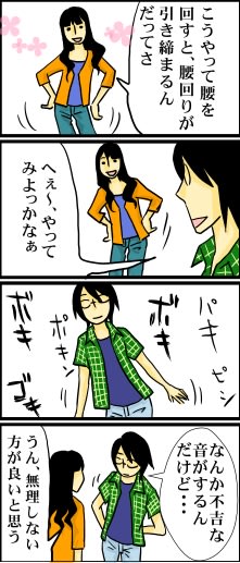 ポッキポキ 2008年09月12日 23:46 腹周りを引き締めてみたくて腰回し運動をやってみたら、関節が凄い音をたてました。 指とか首はよくポキポキ鳴らすんですが、下半身があんなに鳴るってのは知らなかったです。 「日常」カテゴリの最新記事 < 前の記事次の記事 > コメント コメントフォーム 名前 コメント 記事の評価 リセット リセット 顔 星 情報を記憶 コメントを投稿する