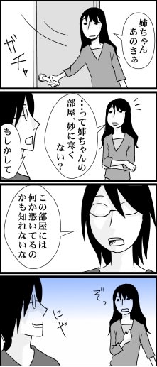 憑いてる 2008年09月25日 22:01 最近寒くなってきたから・・・にしては寒すぎる私の部屋です。 妹の部屋はすぐ隣なんですが、そんなに寒くないです。 多分、微妙に温度を下げる妖怪とかが住んでるんだと思います。(笑) 温度を下げる『下げ女』とか。 「日常」カテゴリの最新記事 < 前の記事次の記事 > コメント コメントフォーム 名前 コメント 記事の評価 リセット リセット 顔 星 情報を記憶 コメントを投稿する