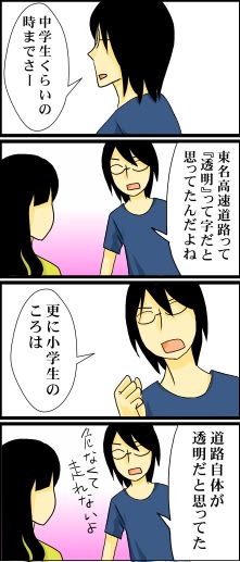 よくテレビで「とうめい高速道路」って聞くけど『とうめい』って漢字は知らなくて、勝手に脳内で『透明』と変換してたんですよねぇ。