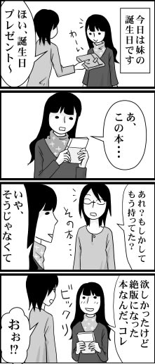シンクロニティだね 2008年11月22日 23:41 絶版になった本だから、読めないと思って諦めてた本を、私が偶然買ってきたようです。 すごい偶然。(笑) 妹は「シンクロ二ティだね」って言ってました。 「日常」カテゴリの最新記事 < 前の記事次の記事 > コメント コメント一覧 (4) 1. としあき 2008年11月22日 23:54 シンクロか・・・<br> シンクロか・・・<br> そういえば昔にどっかのバラエティ番組で、<br> 双子をお互いに知らない場所にいさせて、<br> そこからお互いは会えるのか?とかいう<br> 変企画を見ていたのを覚えています。 0 キヨ がしました 2. 夜叉 2008年11月23日 08:24 一日遅れですが、妹さん、誕生日おめでとう御座い...<br> 一日遅れですが、妹さん、誕生日おめでとう御座います。ぱちぱちぱち<br> それにしても、シンクロとは…いやはや、姉妹というのは不思議なものですね。<br> 私は一人っ子なので、そういったことはありませんので、羨ましい限りです。<br> 最後のコマの、喜んだ顔の妹さんが可愛らしいです。<br> 0 キヨ がしました 3. tanaka 2008年11月23日 11:12 妹さん、昨日が誕生日だったんですか^^<br> 妹さん、昨日が誕生日だったんですか^^<br> 嬉しいかどうか解らないけどおめでとうございます^^;<br> ちなみに私も今月が誕生月です^^;<br> なんとなく親近感が沸きますね^^<br> しかし絶版になった本をプレゼントして<br> 贈られる方もその本を欲していたと言うのは驚きですΣ( ̄□ ̄)<br> なんと言うかもう奇跡ですよね(^▽^) 0 キヨ がしました 4. 清 2008年11月23日 23:53 ★としあきさん★<br> ★としあきさん★<br> あ~、双子って、そういう不思議な力がありそうですよね。<br> その番組の企画も気になります。<br> 普段から絆の深い双子は会えそうな気もしますねぇ。<br> <br> ★夜叉さん★<br> ありがとうございます、妹にも夜叉さんのコメント、見せてあげようと思います。<br> 夜叉さんは一人っ子なんですね。<br> 姉妹がいるのも楽しくて良いけど、一人っ子ってどんな気分なんだろう・・・って興味も少しあります。<br> とりあえず、プレゼントは喜んでもらえたようなので良かったです。<br> <br> ★tanakaさん★<br> あ~、どうなんだろう、嬉しいのかしら・・・。(笑)<br> 妹も微妙な年頃になってきましたよ。<br> あ!tanakaさんもお誕生日!もう終わったのでしょうか、それともこれからかな?<br> 誕生日って、ワクワクしますよね。<br> 妹はお茶が好きなので、お茶関係の本を買ったんですよ。<br> 私はお茶とかよく分からなかったので、写真が綺麗なものを選んで買ったら、こんなシンクロニティが発生しました。(笑) 0 キヨ がしました コメントフォーム 名前 コメント 記事の評価 リセット リセット 顔 星 情報を記憶 コメントを投稿する