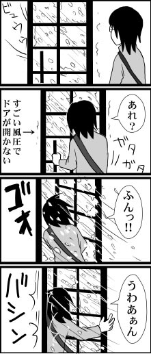 冬の嵐 2008年12月27日 23:55 北海道、冬の嵐でした。昨日だけど。 雪も凄かったけど、風も凄かった。 どれくらい凄いかというと、高速道路を走行中の車から顔を出したぐらい凄かったです。 呼吸できないですよね。 もう、遭難できるレベルでした。(笑) ドアに押し戻されて、挟まっちゃうし。 「日常」カテゴリの最新記事 < 前の記事次の記事 > コメント コメント一覧 (7) 1. としあき 2008年12月28日 17:21 こっちの地域ではあまり雪が降らないので羨ましい...<br> こっちの地域ではあまり雪が降らないので羨ましいと思う反面、<br> そんなことがあるのを知ってしまうと迷ってしまいますね。 0 キヨ がしました 2. マキ 2008年12月28日 19:20 初めまして~。<br> 初めまして~。<br> 最近発見して過去ログ全部読んできました(笑<br> <br> 雪のあまり降らない東海地域民には縁のない話…<br> と思いきや、よくよく考えたら台風に似たようなことをされた気が…(笑<br> くそう台風め…。(その前に台風の日に外に出るな) 0 キヨ がしました 3. 清 2008年12月28日 22:54 ★としあきさん★<br> ★としあきさん★<br> 冬の嵐はそんな頻繁に来ないので、安心して移住してきてください。<br> あっ、そんなつもりは無い、と。(笑)<br> でも、あんまり寒かったりすると、南国へ逃亡したくなります・・・。<br> <br> ★マキさん★<br> 初めまして~!<br> って全部読んで下すったんですか!ありがとうございます。<br> くだらない私の日常を読んで頂けて、恐縮です。<br> わ、マキさんも台風で同じような被害に遭われてるのですね・・・。<br> なるべく悪天候の日は外に出たくないですよねぇ。<br> 0 キヨ がしました 4. マルゴン 2008年12月29日 15:41 うちのとこも玄関が埋まっていました<br> うちのとこも玄関が埋まっていました<br> 今年あったかいなーと思っていた矢先のこの吹雪<br> コンビニにすら行きたくなかった(笑 0 キヨ がしました 5. ホーエン 2008年12月29日 19:04 ほ、北海道の冬は過酷ですね。<br> ほ、北海道の冬は過酷ですね。<br> いやぁ、もう本当にお疲れ様です。<br> 東京は年末にしてまだ14度もあるので、何となく冬のカンジがしません。<br> これが年末かよってカンジです。<br> <br> 家に暖房が付くのはいつになるのやら・・・・。 0 キヨ がしました 6. はる 2008年12月29日 22:56 私も北海道なんですけど、<br> 私も北海道なんですけど、<br> その日は仕事が終わって車で帰ろうとしたら、<br> 雪で車が埋もれ、堀起こしたらドアが凍ってて、<br> やっと車内に入ってエンジンかけようとしたらバッテリーが<br> あがるという災難に遭いました・・・<br> 冬の間だけ沖縄で過ごしたいですよね。 0 キヨ がしました 7. 清 2008年12月30日 18:12 ★マルゴンさん★<br> ★マルゴンさん★<br> そーなんですよね、今年はあったかいなぁ、なんて油断してましたよねぇ。<br> そんなマルゴンさんのお宅は玄関がうまってたと。<br> それは朝からテンション下がっちゃいますね・・・。<br> <br> ★ホーエンさん★<br> 東京14℃!いいなぁ、秋じゃないですか~。<br> 確かに12月っぽくないですね。<br> そういや『寒い寒い』言いながら、今年はまだ電気毛布出してないです。<br> ストーブはガンガンつけてますけどね。<br> <br> ★はるさん★<br> お~~、はるさんも道産子なんですか。<br> わぁ、あの日、ほるさんは大災難だったんですね・・・!<br> ちなみに私は冬は絶対に運転したくないです。<br> そりゃあもう、危なくて同乗者さんの命の保証はできません。 0 キヨ がしました コメントフォーム 名前 コメント 記事の評価 リセット リセット 顔 星 情報を記憶 コメントを投稿する