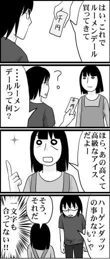 何ひとつ合ってない 2009年08月11日 23:25 たしかに雰囲気は似てるけどねぇ。 まったく違う名前を作っちゃうなんて、ある意味すごいと思った。(笑) 「日常」カテゴリの最新記事 < 前の記事次の記事 > コメント コメント一覧 (8) 1. 葵 2009年08月11日 23:39 ルーメンデール!(>ヮ<)!<br> ルーメンデール!(>ヮ<)!<br> 確かに雰囲気はそんな感じですけどね!!<br> さすがお母様です。<br> どこでどう変換したんだろう……(笑)<br> <br> ハーゲンダッツ、大好きです。<br> 特にサンドになってるキャラメル味の。<br> 最近特に暑いのでアイスばっかり食べています。<br> 家ではなぜか今頃スイカバーブームが来て、我が家はスイカバーです!<br> 昔は苦手だったのですが、今すごい好きです。 0 キヨ がしました 2. なりたり 2009年08月12日 00:09 「ン」があっますよ…とつまらんつっこみを(笑<br> 「ン」があっますよ…とつまらんつっこみを(笑<br> 使いたくなりますね、ルーメンデール。メンデルスゾーンみたい。 0 キヨ がしました 3. しろみ 2009年08月12日 08:43 リーベンデールっていうアイスがありましたよね。<br> リーベンデールっていうアイスがありましたよね。<br> それとまざったとか?<br> 0 キヨ がしました 4. はづき 2009年08月12日 10:46 はっきりと言い切るお母さま、素敵です…[E:shine]<br> はっきりと言い切るお母さま、素敵です…[E:shine]<br> うちの母もそうですが、言葉の雰囲気だけで記憶しているのか…?<br> と思うことがしばしばあります。<br> そんな母はミスドへ行って、『ドーナツ下さい』と言い切る人です。 0 キヨ がしました 5. あいこ 2009年08月12日 18:02 雪見大福の次は、ハーゲンダッツ、アイスネタとは...<br> 雪見大福の次は、ハーゲンダッツ、アイスネタとは、夏らしいですね~(笑)<br> 最近よくアイスを食べるんで、太ってしまいそうなんです・・・。<br> 私なんて、日本語の言い間違えなんてよくありますよ。う~ん、どうしてだろう[E:gawk]<br> たまに、指摘されちゃいます[E:sweat01] 0 キヨ がしました 6. なつこ 2009年08月12日 18:03 「え?ルーメンデール知らないの?」って言われた...<br> 「え?ルーメンデール知らないの?」って言われたら、自分が間違ってるのかと思ってしまいそうなくらい完璧なネーミングですね。<br> 昔、1991年バブル期に雪印から「リーベンデール」って高級アイスが出てました。<br> http://www.youtube.com/watch?v=se3lX9PlyOI<br> 私以上の年代には、懐かしいアイスです。きっとお母さんの中にも残っていると思います。若干、間違っているようですが…(´∀`*)ウフフ 0 キヨ がしました 7. とりぷるなお 2009年08月12日 18:20 ルーメンデール・・。[E:ribbon]最初ローゼンメイ...<br> ルーメンデール・・。[E:ribbon]最初ローゼンメイデンの事かと思いました[E:happy01](アニメ)<br> ・・。あぁ。アイスが食べたくなってきました。(夏バテがすぐそこに・・・。)<br> 皆さん夏バテに気を付けてくださいネ[E:heart]<br> あっ!それと昨日今日と卓球の大会がありました。<br> シングルスは2回戦[E:down]ダブルスは1回戦敗退・・・。<br> でもでも!!!ダブルスは、結成したてで、2.3回ぐらいしか練習してないし!<br> 出来立てホヤ子ちゃんなんですから!!!!シングルスもそりゃあもう<br> つよい人に1セットとったんで・・・・・。<br> 虚しい、聞き苦しい言い訳はこれぐらいにして[E:bomb]<br> 長文、乱文、見苦しい文すみません[E:crying]<br> 0 キヨ がしました 8. 清 2009年08月13日 00:15 ★葵さん★<br> ★葵さん★<br> なんだか姉妹品のようです、ルーメンデール。<br> 私はあんまりハーゲンダッツを食べた事無いんですが、<br> 葵さんが好きだというキャラメル味のは美味しそうなので、今度食べてみようと思います。<br> <br> <br> ★なりたりさん★<br> わ~お、本当だ、『ン』は合っている!(笑)気づきませんでした。<br> ん!メンデルスゾーン?。<br> これまた知らない単語が出てきました。<br> どっかで聞いた事あるような気がするのですが・・・。<br> 後で調べてみようと思います。<br> <br> <br> ★しろみさん★<br> リーベンデール!それも初めて聞く名です。<br> もしや母の言う事は、半分合っていたんでしょうか。(笑)<br> <br> <br> ★はづきさん★<br> はい、もう、言い切っておりました。<br> 多分、『こんな響きの言葉だったよな~』って感じで勝手に言葉を作ってるんでしょうねぇ。(苦笑)<br> はづきさんのお母様のドーナツの武勇伝・・・素敵です。<br> <br> <br> <br> ★あいこさん★<br> そういやアイスネタが続きましたねぇ。<br> 親子そろって、何言ってんだか。って感じです。<br> 私は日本語の間違いだけでなく、よく、どもってしまうのをどうにかしたいもんです。(汗)<br> <br> <br> ★なつこさん★<br> そうなんですよ、なんか本当にそういうものが実在しそうですよね。<br> お~~~、リーベンデール。やはり母の潜在意識の中に、その名が刻みこまれてるんでしょうか。<br> ものすごく近いですよね、ルーメンデール。<br> <br> <br> ★とりぷるなおさん★<br> ローゼンメイデン。確かにこちらも似てますね!<br> ルー