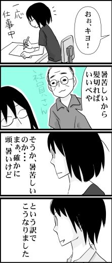 スカッとね 2009年08月29日 23:43 いつも鬱蒼とした頭だったので今回は短くしてみました。 ・・・という4コマを描いてみたものの、イラストにしたら違いがあまり分からなくてガッカリです。 職場は和気あいあいとしてて、良い所です。 「日常」カテゴリの最新記事 < 前の記事次の記事 > コメント コメント一覧 (5) 1. とりぷるなお 2009年08月30日 00:08 私は、小さい頃は(強制的に)ショートでした。(...<br> 私は、小さい頃は(強制的に)ショートでした。(お父さんに<br> 切られる時にめっさ泣いてました[E:sweat02])<br> 今は、肩より15cm位でたっもてます[E:shine]<br> イメチェンをするのは、めんどくさいし、怖いんで…。<br> あっ!!私前々から気になってたんですが、<br> 清さんは一番髪が長いときはどの位だったんですか?! 0 キヨ がしました 2. 清 2009年08月30日 20:56 ★とりぷるなおさん★<br> ★とりぷるなおさん★<br> 強制的にショートですか!そりゃ泣きたくなっちゃいますね。<br> お父様のこだわりだったのか・・・。<br> 肩から15センチですか。長くもなく、短くもなく、ちょうどよい長さですねぇ。<br> あ、私ですか?<br> 一番長い時では脇の下くらいまでありました。<br> ちょうど、2006年3月辺りの日記で当時の髪型が見れると思います。 0 キヨ がしました 3. Kaz 2009年08月30日 22:45 こんにちは!いつも楽しく日記を読ませていただい...<br> こんにちは!いつも楽しく日記を読ませていただいてます。<br> <br> 髪型って、短くしたりパーマかけたり、なんかしら変えると気持ちも変わりますよね。<br> ところで一瞬、4コマ目が絶望先生に見えました 笑 0 キヨ がしました 4. なつこ 2009年08月31日 00:28 私は現在ブラ紐ラインです。<br> 私は現在ブラ紐ラインです。<br> 本当はウエスラインが理想でいつも伸ばしていますが、5年に1回衝動的にイラストの清さんくらいまでバッサリいって後悔の繰り返しです。笑<br> 髪って、切ると案外重かったんだなぁって気がつきませんか。<br> あまり切ってないようでも、シャンプーの時によくわかりますよね。 0 キヨ がしました 5. 清 2009年09月02日 23:58 ★Kazさん★<br> ★Kazさん★<br> こんにちわ~!コメントありがとうございます。<br> 髪型をガラッと変えるのって楽しいですよねぇ。<br> 特に短くしたら、頭が軽くなって不思議な感覚になります。<br> あ、絶望先生、好きです。漫画もってないけど。<br> やっぱり好きな絵柄って無意識のうちに影響されちゃうんですかね。<br> <br> <br> ★なつこさん★<br> ウエストラインは憧れますね。<br> でもって、ゆる~くウェーブをかけてみたいです。<br> なつこさんは凄く似合いそうな気がします!<br> カットした後のシャンプーは、ちょっと楽しみだったりします(笑) 0 キヨ がしました コメントフォーム 名前 コメント 記事の評価 リセット リセット 顔 星 情報を記憶 コメントを投稿する