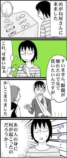 何が起きたの 2009年09月22日 23:27 そりゃメガネも破損するだろなぁ。 ってくらい大怪我した人が、メガネを直しにきてました。 「まち歩き」カテゴリの最新記事 < 前の記事次の記事 > コメント コメント一覧 (6) 1. 黄ろ染 2009年09月23日 05:39 メガネが壊れた理由ですね(笑)<br> メガネが壊れた理由ですね(笑)<br> 最近急激に視力が落ち始めたのでメガネが必要になるかも、、、<br> 遅かれ早かれって感じですが、事故って3コマ目の人のように怪我してしまう前に対処したほうがいいですよね<br> 0 キヨ がしました 2. あいこ 2009年09月23日 07:17 この怪我した人には、スペアが家にあったんですね。<br> この怪我した人には、スペアが家にあったんですね。<br> ちょっと、ホッとしました(?)うちにも、何かあった時のためにスペアを買っとこうかな(笑)<br> 事情は知りませんが、災難でしたね~[E:coldsweats01] 0 キヨ がしました 3. ホーエン 2009年09月23日 17:44 な、なんかメガネ直す前に色々と突っ込んだ方が良...<br> な、なんかメガネ直す前に色々と突っ込んだ方が良さそうな人ですね。<br> <br> 0 キヨ がしました 4. なつこ 2009年09月24日 13:23 事故… リンチ… 強盗…<br> 事故… リンチ… 強盗…<br> 強烈すぎますね。笑 ←笑ったらダメですよね。笑<br> 店員さんもすました顔して「何があったんや!」と心のなかでつっこんでいること間違いなしですね。<br> めがね以外にも治さないといけない箇所が多そうでお気の毒です。 (゜-Å) ホロリ 0 キヨ がしました 5. とりぷるなお 2009年09月25日 17:02 私はこれ見たときに「誰かこの人の替わりに<br> 私はこれ見たときに「誰かこの人の替わりに<br> 行ってやれョ…」とまず、最初に思いました[E:coldsweats01]<br> 店員さん笑いをマジでこらえていたとおもいます…笑<br> 後で(これみたいに)話のネタにされただろーなァ~[E:up] 0 キヨ がしました 6. 清 2009年09月25日 22:39 ★黄ろ染さん★<br> ★黄ろ染さん★<br> 分かりやすい外見をされていて、心配になってしまいました。<br> 本当に何があったのかしらん。<br> 黄ろ染さんは今のところ、裸眼なんですか?いいなぁ。<br> あ、でも悪くなってきてるのかぁ。眼鏡をかけなくて良い生活に憧れます・・・。<br> <br> <br> ★あいこさん★<br> この方はスペアをお持ちだったようです。<br> 私も以前使っていた眼鏡があるので、万が一、この方のように大けがをしても安心です。(笑)<br> <br> <br> ★ホーエンさん★<br> 本当に「どうしたの!?その大けがは!」って聞きたくなりました。<br> 痛々しかったです・・・。<br> <br> <br> ★なつこさん★<br> リンチ!そうか、その手があったか。(笑)<br> この方を見たとき、人間、生きてれば色々あるんだなーって思いました。<br> 眼鏡はすぐ治るかも知れないけど、怪我の方はそうもいかないですからねぇ。<br> お大事に・・・。<br> <br> <br> ★とりぷるなおさん★<br> そうですよね!誰か代わりに行ってあげて![E:sweat01]<br> 店員さん、休憩室かロッカー室で、話題にしてることでしょう。(笑)<br> <br> 0 キヨ がしました コメントフォーム 名前 コメント 記事の評価 リセット リセット 顔 星 情報を記憶 コメントを投稿する
