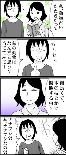 動物じゃないしね 2009年09月27日 23:43 ちなみに私は黒豹です。 「日常」カテゴリの最新記事 < 前の記事次の記事 > コメント コメント一覧 (6) 1. なつこ 2009年09月28日 00:29 占いというよりもはやイメージ重視!うふふ<br> 占いというよりもはやイメージ重視!うふふ<br> それにしてもナナフシは乙女には辛いですね。(´Д⊂グスン<br> なんだろう…<br> 外の音に流されず、マイペースで静か…決してでしゃばらず、けれども存在感がきちんとある…そして細い?<br> ナナフシ・・・ Σ(゜д゜lll)ハッツ 0 キヨ がしました 2. なりたり 2009年09月28日 12:56 スレンダーってことですね☆<br> スレンダーってことですね☆ 0 キヨ がしました 3. 夢人 2009年09月29日 17:43 ネットで生年月日をいれて調べたら 私は虎らしいです<br> ネットで生年月日をいれて調べたら 私は虎らしいです<br> 書いてあることは驚くほど当たってました<br> 清さんは黒豹ですか かっこいいですね 0 キヨ がしました 4. 清 2009年09月30日 23:10 ★なつこさん★<br> ★なつこさん★<br> 見た目でナナフシに決定されました。とほほ・・・。<br> ナナフシ、擬態能力は凄いですけどねぇ。<br> どっから見ても木です。<br> <br> <br> ★なりたりさん★<br> 確かにナナフシは究極にスレンダーですけどね。(笑)<br> くびれも何もなくて、ちょっと複雑な気分になっちゃいました。<br> <br> <br> ★夢人さん★<br> 夢人さんはトラですか~。<br> 親分的存在って書いてますね。確かに夢人さんの言うことには説得力があるし、人を引き付ける力があるのかも。<br> <br> 0 キヨ がしました 5. マキ 2009年10月03日 00:22 出遅れコメントですが私チーターです。<br> 出遅れコメントですが私チーターです。<br> 「諦めの早いチャレンジャー」って書かれてた記憶が(笑<br> あと掴みどころがないらしい(納得)<br> <br> <br> ちなみに高校時代、私の周りは<br> チーター・黒豹・虎・ライオンという猛獣の群れの中に<br> 仔ヤギが一匹混じってました。あの子いつか食われる。 0 キヨ がしました 6. 清 2009年10月04日 00:40 ★マキさん★<br> ★マキさん★<br> すごーい。本当、見事に猛獣だらけですね。<br> そういや動物占いって、ペガサスがいるんですが、あれも動物のジャンルに入れちゃって良いのかな?っていっつも思います。<br> まぁ、馬みたいなもんか・・・。 0 キヨ がしました コメントフォーム 名前 コメント 記事の評価 リセット リセット 顔 星 情報を記憶 コメントを投稿する
