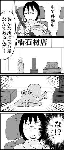なぜそのポーズなのか 2009年09月30日 23:34 墓石や可愛い石像にまじって、こんな奇妙なポーズのカエルがいました。 写真撮りたかったんですけどねぇ・・・走行中だったので我慢しました。 「日常」カテゴリの最新記事 < 前の記事次の記事 > コメント コメント一覧 (8) 1. なつこ 2009年10月01日 01:22 不審な人影かと思ったらカエル君でしたのね。安心...<br> 不審な人影かと思ったらカエル君でしたのね。安心しました。<br> それにしても世にも奇妙なポーズで…珍しいですね。<br> 可愛い石像に擬態してるのつもりだったり…ああ、まだナナフシ引きずってる。クス 0 キヨ がしました 2. 甘楽 2009年10月01日 02:01 確かにこのポーズは気になる…!<br> 確かにこのポーズは気になる…!<br> <br> わー、この石造デザインした人とお近づきになりたい!!!(笑 0 キヨ がしました 3. なりたり 2009年10月01日 12:17 結構石材店にはピカチュウとか可愛い系おいてあり...<br> 結構石材店にはピカチュウとか可愛い系おいてありますよね。<br> しかしこのカエルは度肝を抜かれる(笑 0 キヨ がしました 4. 清 2009年10月02日 00:12 ★なつこさん★<br> ★なつこさん★<br> 不審な人影だったら・・・!恐怖体験ですね(笑)<br> 全体的に可愛いフォルムなんですが、お尻は綺麗に割れていたりして、デザインした人の顔を見てみたいなぁ・・・なんて思いました。<br> ナナフシの件は、しばらく忘れられそうにありません(笑)<br> <br> <br> ★甘楽さん★<br> ね、気になるポーズですよねぇ。本当は、もっとお尻がグッと上にあがってたんですが、私の画力では表現しきれませんでした。<br> 確かに、どんな人がデザインしたのか、すごく気になります。<br> <br> <br> ★なりたりさん★<br> 珍しいのでは、アンパンマンは見たことあります。<br> ピカチュウも可愛いだろうなぁ。<br> 私も見事に度肝抜かれました。(笑) 0 キヨ がしました 5. momo 2009年10月02日 08:27 ○ッキーも○ティも見たことあります。<br> ○ッキーも○ティも見たことあります。 0 キヨ がしました 6. 清 2009年10月04日 00:36 ★momoさん★<br> ★momoさん★<br> なにやら、色んなバリエーションがあるようですねぇ。<br> すごいなぁ。ああいうのって、一つずつ手作業で作ってるんですかねぇ? 0 キヨ がしました 7. ホーエン 2009年10月04日 23:52 こ、これは・・・。<br> こ、これは・・・。<br> 興味深そうな瞳で見つめる姿がなんとも不思議ですよね。<br> <br> こんなのあったら、そりゃ気になりますよね。 0 キヨ がしました 8. 清 2009年10月05日 00:10 ★ホーエンさん★<br> ★ホーエンさん★<br> 本当に謎の像です。何を見てるんでしょうかねぇ。<br> お尻が人間並みに、綺麗に割れてました。(笑)<br> 妹は「浣腸を待ってるカエルだ」と言ってました。<br> 0 キヨ がしました コメントフォーム 名前 コメント 記事の評価 リセット リセット 顔 星 情報を記憶 コメントを投稿する