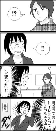 わざとじゃないんだよぉぉ 2009年10月25日 22:58 ボーッとしながら駅のトイレに入ったところ、なんとそこは男子トイレでした。 松潤に似た若者に、不思議そうに見られてしまいました。 「すいません、わざとじゃないんです!」と心の中で謝りながら、静かに退場しました・・・。 なんかもう、おっちょこちょいってレベルじゃないよなぁ。 「日常」カテゴリの最新記事 < 前の記事次の記事 > コメント コメント一覧 (8) 1. なつこ 2009年10月25日 23:46 松潤似ですか。いっそのこと開き直って「写メいい...<br> 松潤似ですか。いっそのこと開き直って「写メいいですか?」って言ってほしかったなぁ!笑<br> 私もありますよ。男子トイレ。でも無人で心底ホッとしましたもん。<br> あの動揺を若い男の子に見られるのは恥ずかしですね。<br> そこから恋でも生まれたら素敵なエピソードになるんでしょうけど…<br> け、マンガみたいにはいかねぇか!(*´ー`) フッ 0 キヨ がしました 2. momo 2009年10月26日 08:48 気付いただけ良かったじゃないですか~<br> 気付いただけ良かったじゃないですか~ 0 キヨ がしました 3. 夢人 2009年10月26日 17:53 大阪のおばちゃんは 映画館やらレジャー会場では...<br> 大阪のおばちゃんは 映画館やらレジャー会場では 満員の女子トイレを横目に 今日だけ男 と言って平気で男子トイレに入ります 日常茶飯事ですよ 0 キヨ がしました 4. 綿 2009年10月26日 18:28 私も似たようなことありました!!<br> 私も似たようなことありました!!<br> 私の場合はメール打ちながら前の人についていったら<br> 男子トイレに入ってしまったという(笑)<br> いっぱい男性がいて本当に恥ずかしかったです。。。 0 キヨ がしました 5. 凸 2009年10月26日 20:50 私、用を足した後に気づいた事があります・・・。<br> 私、用を足した後に気づいた事があります・・・。<br> 男女共用なんだなーと入った後に壁が青くて・・・。<br> 恥ずかしいですよねー。 0 キヨ がしました 6. とりぷるなお 2009年10月27日 18:07 あらっ…私はお陰様でまだ未経験<br> あらっ…私はお陰様でまだ未経験<br> です[E:coldsweats01]<br> でもまだまだ幸先長いのでこれから<br> 5.6回はありそうです(*´ー`)<br> なつこさんのように無人なら良いのですが・・ 0 キヨ がしました 7. としあき 2009年10月29日 02:53 四コマに出てる男の人も、<br> 四コマに出てる男の人も、<br> 女の人に見えてしまいました。 0 キヨ がしました 8. 清 2009年10月30日 23:23 ★なつこさん★<br> ★なつこさん★<br> あの濃い眉毛と、日本人離れした瞳が松潤っぽかったです。<br> あの場で写メを撮っていたら、完全に痴女になるところでした(笑)<br> 私の場合、無人だったら気づかずに用を足していたかと思われます・・・。<br> トイレから始まる恋・・・憧れますね。(笑)<br> <br> <br> ★momoさん★<br> はい、気付けて良かったです。心底良かったと思います。<br> あぁ、恥ずかしかった・・・。<br> <br> <br> ★夢人さん★<br> 大阪の女性は強いですねぇ。<br> というか愛橋があるのかなぁ。それにしても日常茶飯事なんですか。(笑)<br> 私も次回から、その作戦で行こうかな~。<br> <br> <br> ★綿さん★<br> 綿さんにもそんな経験が!あ~、でもそんな状況なら、ついて行っちゃいそう(笑)。<br> しかもいっぱいいたんですね、男性の方々。<br> あちゃ~(汗)<br> <br> <br> ★凸さん★<br> お~う、用を足した後に気づいちゃいましたか。<br> でもそれは、男女共用っぽく見えるトイレが悪いですね!(断言)<br> それにしても気付いたときは、やっぱり恥ずかしいだろうなぁ。(笑)<br> <br> <br> ★とりぷるなおさん★<br> できる事なら、一生未経験のままが良いと思います。<br> 万が一、間違って男子トイレに入ったときは、騒がず、焦らず、落ち着いて静かに退散するのが良いかと思います。<br> 「きゃ~」とか言うと、余計恥ずかしいような気がします。(笑)<br> <br> <br> ★としあきさん★<br> 私も描きながら、「この人、女っぽいなぁ・・・うーむ・・・」と思いながら描いてました。<br> まだまだ修行が足りないです。<br> <br> <br> 0 キヨ がしました コメントフォーム 名前 コメント 記事の評価 リセット リセット 顔 星 情報を記憶 コメントを投稿する