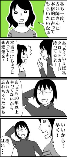 いいから! 2009年11月09日 23:08 なにやら急にテンションの高くなる妹でした。 婚活中の妹は、恋愛運を占ってもらいたいらしい。(笑) 久しぶりにやったら、ちょっと楽しかったので、たま~に占いしてみるかも。 そして引き続き年賀状欲しい人、募集中です。 詳しくはこちら。 「日常」カテゴリの最新記事 < 前の記事次の記事 > コメント コメント一覧 (4) 1. momo 2009年11月10日 08:19 ちょっと前にテレビで占い特集をやっていて<br> ちょっと前にテレビで占い特集をやっていて<br> 占ってもらいたいな~って人のHP検索してみたら、<br> 見事に「来年6月まで予約いっぱいです」ってトップに書かれていました・・・<br> テレビの力ってすごいですね。 0 キヨ がしました 2. なつこ 2009年11月11日 16:32 統計学と言いながら「うーむ。」とうなってしまう...<br> 統計学と言いながら「うーむ。」とうなってしまうのが占いですよね。<br> 私がこれまでで一番「あ、これいい。」と思った占いはこれです。<br> http://www.genjidaigaku.jp/uranai/index.asp<br> 「源氏物語占い:14人の姫君・・・誰に一番近いかな。」<br> 生年月日を入れて、(。・ω・。)σ凸ポチッとするだけ!無料です。<br> 面白いので妹さんに教えてあげてください。<br> ちなみに私は “明石の君” アゲマン体質らしいです。(*^ー^)vブイ 0 キヨ がしました 3. ホーエン 2009年11月11日 23:21 タロットカードいいですよね。<br> タロットカードいいですよね。<br> 僕も一時集めてました。<br> 結構絵柄にもバラつきがあって楽しいですよね。<br> <br> でもまだ一度も使った事が無いんですが・・・・(ぉ。 0 キヨ がしました 4. 清 2009年11月12日 00:05 ★momoさん★<br> ★momoさん★<br> テレビの影響力、すごいなぁ!<br> 来年の6月までって[E:coldsweats02] 相当当たるのかなぁ。<br> ほとぼりの冷めたころに、申し込みたい所ですね。<br> <br> <br> ★なつこさん★<br> 占い、面白いですよねぇ。私もさっそく源氏物語占い、やってみたのですが、『六条の御息所』でした。<br> なにいやらジェラシーの塊らしいです。<br> 当たってるけど『塊』って程でもないと思うけどなぁ。(笑)<br> <br> <br> <br> ★ホーエンさん★<br> そうそう、あの絵が面白いですよね。<br> 見てるだけで楽しくなってきちゃいます。<br> 特に私が持ってるやつは、個性的な絵柄が特徴です。<br> 死神のカードも可愛いです。今度、写真に撮ってアップしようかなぁ。<br> まだ未使用なんですか~。是非占ってみてください~。 0 キヨ がしました コメントフォーム 名前 コメント 記事の評価 リセット リセット 顔 星 情報を記憶 コメントを投稿する