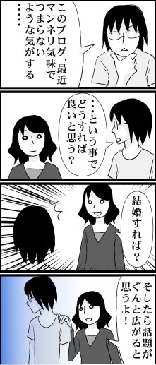 そればっかりは 2009年11月12日 23:49 すごく画期的で、ナイスなアイディアだとは思うんですけどねぇ。 実行するのは難しいです。(笑) 「日常」カテゴリの最新記事 < 前の記事次の記事 > コメント コメント一覧 (7) 1. momo 2009年11月13日 12:44 ものすごくタイムリーな話をありがとうございます。笑<br> ものすごくタイムリーな話をありがとうございます。笑<br> 確かに決まってから、話(悩み)は尽きないです。 0 キヨ がしました 2. なつこ 2009年11月13日 17:30 あんな発想豊かな夢を見る清さんならまだまだシン...<br> あんな発想豊かな夢を見る清さんならまだまだシングルでも炸裂ですよ。<br> 最近、一番リアルな夢は、昔好きだったアイドルが離婚して1人暮らしを始め、マンションの隣室に引っ越してくる。そして仲良くなる!と云う夢の様な夢でした。あー夢かチキショー! 0 キヨ がしました 3. にーな 2009年11月14日 06:51 久々にこんにちは!<br> 久々にこんにちは!<br> 清さん自身も家族のからみも面白くて大好きですよ♪<br> <br> でも多分、ブロガーさんはみんな自分のブログを、「最近つまらないような。。。」と考えてしまうものかも。<br> 私はしょっちゅうありますよ~~^^;<br> 私ももし結婚したらネタ満載になるかしらー! 0 キヨ がしました 4. リリィ 2009年11月14日 07:42 妹さん、ナイス!<br> 妹さん、ナイス!<br> <br> が、しかし、私は今のままで、読んでて十分楽しいです。<br> 方向性は自然に変わると思うので<br> いまはいまのままでいいのではないでしょうか?<br> <br> 0 キヨ がしました 5. 清 2009年11月14日 22:33 ★momoさん★<br> ★momoさん★<br> やっぱり・・・!やっぱり生活に劇的な変化があると、話題は尽きないんでしょうね!<br> あ~、悩みの部分はいらないなぁ。(笑)<br> <br> <br> ★なつこさん★<br> 最近は変な夢ばかり見るようになりました。<br> ちなみに今日は、知らない青年とイチャイチャする夢でした。<br> 欲求不満なんでしょうか(笑)。<br> なつこさんも、かなり素敵な夢を見たようですね。<br> アイドルが引っ越してくるなんて・・・夢でも良いから、そんな経験してみたいです。<br> <br> <br> ★にーなさん★<br> やっぱり自分のブログだから、見飽きちゃってるのかなぁ。<br> そんならしょうがないって気もします[E:catface]<br> これからも、こんな調子でやっていこうと思います。<br> にーなさんのブログではいろんな話題がたくさんで、いつ遊びにいっても楽しいです!<br> <br> <br> ★リリィさん★<br> ううぅ・・・なんと温かいお言葉でしょう。<br> ありがとうございます。<br> 無理に話題作りしないで、流れに身を任せることにします(笑)<br> でもなぁ。彼氏の一人でもできれば、きっと楽しいだろうなぁ。[E:bleah] 0 キヨ がしました 6. こっそり拝見しとります 2009年11月17日 02:45 これがマンネリと言うのなら<br> これがマンネリと言うのなら<br> マンネリ具合もまた面白いと言わざるをえないです。<br> <br> とりあえず僕と結婚してみませんか姉さん! 0 キヨ がしました 7. 清 2009年11月18日 23:14 ★こっそり拝見しとりますさん★<br> ★こっそり拝見しとりますさん★<br> 面白いですか~。そう言われると一安心です。<br> というか、結婚してくださるんですか!<br> おぉ・・・仏様のような人だ・・・。<br> 妹に「ナナフシみたい」「気持ち悪いから近付かないで」「姉ちゃんって、人の神経逆なでするの上手いよね」<br> ってよく言われるような人間ですが良いでしょうか。(笑) 0 キヨ がしました コメントフォーム 名前 コメント 記事の評価 リセット リセット 顔 星 情報を記憶 コメントを投稿する
