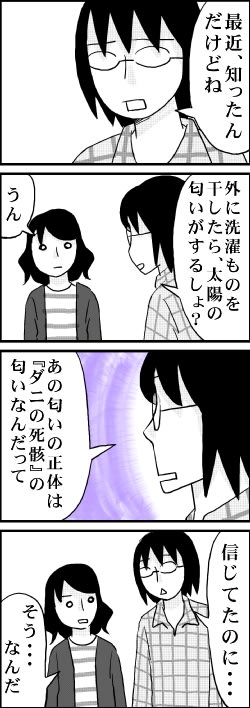 お日さまの匂い、嫌いじゃないよ 2010年05月30日 23:53 いや、でも100%ダニの死骸の香りって訳でもなさそうですけどね。 「うんちく・小ネタ」カテゴリの最新記事 < 前の記事次の記事 > コメント コメント一覧 (6) 1. つららくるみ 2010年05月31日 16:45 お布団を干した時の匂い<br> お布団を干した時の匂い<br> と、聞きました。<br> <br> だとしても<br> キライじゃないです。<br> <br> むしろ、好き[E:happy02] 0 キヨ がしました 2. なつこ 2010年05月31日 22:46 ヒイィィィ!!!!(゜ロ゜ノ)ノマジデスカー!シラナカッタ!!!!<br> ヒイィィィ!!!!(゜ロ゜ノ)ノマジデスカー!シラナカッタ!!!!<br> んじゃ、某柔軟仕上げ剤の「お日様の香り」って…ダニの? Σ(゜д゜lll)<br> がっかりするので、太陽の匂いってことで…。 0 キヨ がしました 3. 正臣 2010年06月01日 00:32 太陽はダニの骸の匂いがするんですか!!<br> 太陽はダニの骸の匂いがするんですか!!<br> <br> でも逆に真実を知ってしまったほうが清々しい気が....しませんね。 0 キヨ がしました 4. まろ 2010年06月01日 09:51 ダニの死骸、良いニオイ!<br> ダニの死骸、良いニオイ!<br> [E:smile] 0 キヨ がしました 5. のっち 2010年06月01日 20:20 マジですかっ(°□°;)<br> マジですかっ(°□°;)<br> <br> 私も信じてました…(T_T)<br> <br> ダニかぁ~ 0 キヨ がしました 6. 清 2010年06月04日 21:18 ★つららくるみさん★<br> ★つららくるみさん★<br> 私も今更嫌いになんてなれないです、太陽(ダニ)の匂い。<br> 布団を干すたび、ちょっと複雑な心境になると思いますが・・・。<br> <br> <br> <br> <br> ★なつこさん★<br> 私も同じ気持ちになりました。!(゜ロ゜ノ)←こんな気持ち。<br> 太陽の匂いの柔軟剤ありますよね~。ダニの匂いの柔軟剤・・・と考えると嫌だなぁ。(笑)<br> <br> <br> <br> <br> ★正臣さん★<br> 太陽光線にさらされて死んだダニの匂いらしいです。<br> あの匂いはダニが死んだ証拠だと思えば・・・清々しいといえば清々しいです(笑)<br> <br> <br> <br> <br> <br> ★まろさん★<br> ですよね、いい匂いです。(笑)<br> やっぱり嫌いになれないあの匂い。<br> <br> <br> <br> <br> ★のっちさん★<br> 物心ついた時から、あれは太陽の匂いだと認識してましたからね。<br> 今更そんな事言われても信じられません。(笑<br> )<br> <br> 0 キヨ がしました コメントフォーム 名前 コメント 記事の評価 リセット リセット 顔 星 情報を記憶 コメントを投稿する