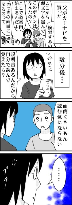 読んでよ、説明書を 2010年08月30日 22:54 父が念願のカーナビを買ったのですが、使い方を全~部私に教わろうとするんですよねえぇ。 画面見れば、「ここ押せば検索できるんだろ」とか「ここで道案内が始まるんだろな」とか、だいたい分かるので教えてあげてたのですが。 説明書読めば良いのに。 「家族関連」カテゴリの最新記事 < 前の記事次の記事 > コメント コメント一覧 (5) 1. yoyo 2010年08月31日 10:07 そうそうそうそう!<br> そうそうそうそう!<br> 年配の方は説明書を読まない!<br> まぁ確かにすっごい分厚い説明書で細かい字でいっぱい書いてあるから、老眼の人は見ただけでげんなりなのかも。<br> 私も母がヨーロッパに行くときに『地球の歩き方』だけ買って来て「読んどいて」と渡されたことが(^^;<br> 私がそれを熟読して、ツアースケジュールにある街の紹介ページや、現地通貨、お天気など必要と思われるところにインデックス付きの付箋を貼り、さらに大事なところに蛍光ペンでマークをするということをしました。<br> 秘書?あるいは奴隷?と思いましたが・・・(^^; 0 キヨ がしました 2. なつこ 2010年08月31日 11:09 読んで学習するほうが早く使いこなせるようになる...<br> 読んで学習するほうが早く使いこなせるようになるのにね。<br> 最低限の自分に必要な操作を人から聞いて覚えようとするくせに、こちらが答えられなかったりするとムッとされたりするのでナンダヨ (o`ェ´o)と思うのよね。説明書を読まない旦那に無能扱いされること18年。<br> 人生は耐えるの連続です。(*´ー`) フッ 0 キヨ がしました 3. のっち 2010年08月31日 12:24 最近の説明書って分厚いから読まずに触って覚えて...<br> 最近の説明書って分厚いから読まずに触って覚えていきますが、親世代にはそれも壊しちゃいそうでそうなるんだろうな[E:gawk]<br> <br> でも、口にだしてそう言われちゃうとムッとなりますよね[E:pout]<br> <br> 0 キヨ がしました 4. マキ 2010年09月02日 00:01 大学時代に友人が「武将占い」という本を持ってき...<br> 大学時代に友人が「武将占い」という本を持ってきたんですが。<br> 前田利家タイプ(=私)が「説明書を読まない」と書かれてました…。<br> 色々当たってて笑った記憶があります。<br> 触って覚えるもん…壊したことないもん大丈夫だもん…。 0 キヨ がしました 5. 清 2010年09月02日 23:40 ★yoyoさん★<br> ★yoyoさん★<br> yoyoさんも経験ありですか。<br> って、旅行の下調べ全部やったんですか!?そりゃあ私以上だ(笑)!<br> さすがに頼まれても、そこまでしないなぁ。お駄賃くれるなら引き受けるかもしれないですが。<br> <br> <br> ★なつこさん★<br> そう!そうなんですよ!絶対、自分で読んだほうが覚えると思うんですけどね。<br> 便利な使い方なんかも分かりそうだし。<br> なつこさんの所は、は旦那さんが説明書を読まない人ですかー・・・。<br> うぅ・・・耐えるの辛い。<br> <br> <br> ★のっちさん★<br> そうは言っても、私もできる限り説明書読まない派なんですけどね。自力でなんとかします。<br> 本当に分からないところだけ、説明書に頼るかんじです。<br> なんというか・・・ハナっから自分で覚える気がないってのが悲しいです。<br> <br> <br> ★マキさん★<br> わっ!武将占いすごいですね(笑)。当たってるんだ。<br> 電化製品って適当に触ってれば、なんとか動いてくれますよね(笑)。<br> あ、ホームベーカリーは適当に触るの恐かったので、説明書に釘付けでした。<br> 関係ないけど、一冊しかない説明書に水こぼしてヨレヨレにしちゃいました。<br> 0 キヨ がしました コメントフォーム 名前 コメント 記事の評価 リセット リセット 顔 星 情報を記憶 コメントを投稿する
