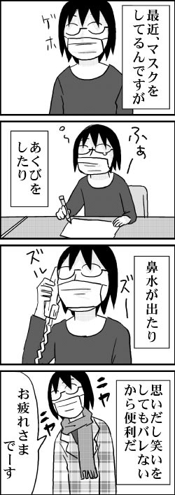 アクビもハナミズも思い出し笑いもノーメークも隠せる上に、最近のマスクは高機能なので手放せなくなります~<br>