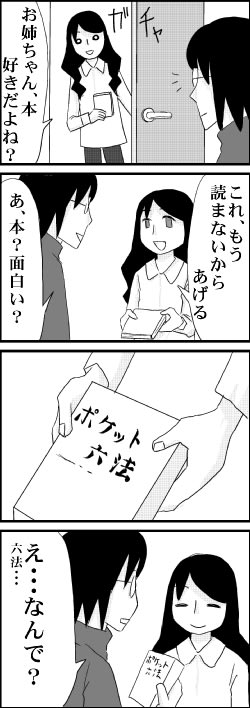 ポケット 2011年02月23日 23:55 妹が、大学生のころに使っていたというポケット六法をもらいましたが・・・いや、もらったって言うよし、押し付けられたと言ったほうが正確かも知れないです(笑)。 何に使えばよいのか・・・。 最初、読破しようと思ったのですが、それは無理ってもんでした。 「家族関連」カテゴリの最新記事 < 前の記事次の記事 > コメント コメント一覧 (5) 1. マキ 2011年02月24日 00:26 デイリー六法とか判例六法とか<br> デイリー六法とか判例六法とか<br> 実家に4冊ほどあると思いますがいりますか?(笑<br> (法律大改正期に大学生だったので毎年買わなきゃいけなかったんです…)<br> 読み込むなら判例六法がおすすめです。結構面白い。 0 キヨ がしました 2. のっち 2011年02月27日 12:36 六法全書…手にしたことないですね‐ω‐<br> 六法全書…手にしたことないですね‐ω‐<br> <br> ガンバれば読破できるかもしれませんよ!!<br> 頑張ってください<br> <br> その次はタウンページですね 0 キヨ がしました 3. 清 2011年02月27日 22:26 ★マキさん★<br> ★マキさん★<br> 六法にもいろいろあるんですね[E:catface]。<br> 今の私にはポケット版があるので・・・うん。<br> 結局、少しも読んでないので、ちょっと開いてみようかしらん。<br> <br> <br> ★のっちさん★<br> 読破!できたら格好良いなぁ。<br> ひとつも頭に入らなさそうだけど・・・。<br> タウンページは更にレベルが高そうです。<br> 0 キヨ がしました 4. あいこ 2011年02月28日 17:21 六法全書って解説無いとさっぱり分からんで苦手です。<br> 六法全書って解説無いとさっぱり分からんで苦手です。<br> 最近知ったのですが、ふりがな付きのが本屋に売ってましたw<br> 日本国憲法の前文を覚える歌とか知ってますか?<br> http://www.youtube.com/results?search_query=%E6%97%A5%E6%9C%AC%E5%9B%BD%E6%86%B2%E6%B3%95%E3%81%AE%E6%AD%8C&aq=0ユーチューブにあったので、聞いてみてください。知ってたらどうぞ忘れてください[E:coldsweats01] 0 キヨ がしました 5. 清 2011年02月28日 23:04 ★あいこさん★<br> ★あいこさん★<br> へぇ!!こんな歌あるんですか!<br> 知らんかったです。爽やかに歌い上げてますね。<br> 0 キヨ がしました コメントフォーム 名前 コメント 記事の評価 リセット リセット 顔 星 情報を記憶 コメントを投稿する
