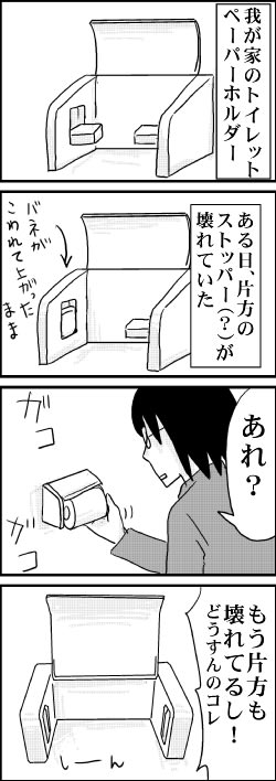 困ったね 2011年04月12日 23:42 いつも何気なく使ってたけど、あのストッパーのありがたみが良くわかりました。 片方だけ壊れたときは、もう片方のストッパーに頼ってたのですが、両方壊れたら・・・どうすりゃいいんだ。 カテゴリなしの他の記事 < 前の記事次の記事 > コメント コメント一覧 (4) 1. あいこ 2011年04月14日 18:09 どうすりゃいいんでしょうね。<br> どうすりゃいいんでしょうね。<br> う~ん・・・・。<br> 手で回しますかね。 0 キヨ がしました 2. 風紀 2011年04月14日 21:50 直置きですねw<br> 直置きですねw 0 キヨ がしました 3. Unknown 2011年04月15日 00:06 ホームセンターで購入 取付簡単<br> ホームセンターで購入 取付簡単 0 キヨ がしました 4. 清 2011年04月15日 23:30 ★あいこさん★<br> ★あいこさん★<br> 壊れてからしばらく経つのですが、まだ壊れたやつ使ってます。<br> なんとか使えるもんです[E:scissors]。<br> <br> <br> ★風紀さん★<br> 直置き[E:catface]。私も最初は考えました。が、しかし、あえて壊れたまま使い続けてます。<br> コツをつかめば、ストッパーのバネがなくても使えるという事が判明したのです。<br> <br> <br> ★名無しさん★<br> 一番確実な解決方法ですね。一瞬、買い替えも考えたのですが、このまま使い続ける方を選びました。<br> 家族そろって貧乏性です。<br> 0 キヨ がしました コメントフォーム 名前 コメント 記事の評価 リセット リセット 顔 星 情報を記憶 コメントを投稿する