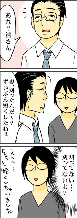 刈ってはいない 2011年11月15日 23:51 髪を切った人に対して「頭切ったの?」と言う人がいますが、それと同じくらいの違和感がありました(笑) カテゴリなしの他の記事 < 前の記事次の記事 > コメント コメント一覧 (4) 1. 敬 2011年11月17日 09:01 タイトルがツボでした(^w^)<br> タイトルがツボでした(^w^)<br> <br> 坊主の子とかには使いますかね、バリカン使うし<br> <br> 私も冬に向けて何故か髪を短くしましたf^_^; 0 キヨ がしました 2. 清 2011年11月17日 18:09 ★敬さん★<br> ★敬さん★<br> 真っ先に、「刈ってはいないんですけどね」って突っ込んでしまいました。(心の中で)<br> 冬でも切りたくなりますよねぇ。髪洗うの楽です。 0 キヨ がしました 3. あいこ 2011年11月19日 12:09 あら。髪を切ったのですね。<br> あら。髪を切ったのですね。<br> きっとお似合いでしょうね。(ΦωΦ)フフフ…<br> 0 キヨ がしました 4. 清 2011年11月20日 00:47 ★あいこさん★<br> ★あいこさん★<br> 似合ってるかどうか分かりませんが、男前になりました[E:coldsweats01]<br> 結構ラクなので、しばらくはショートでいこうかな~って思ってます。 0 キヨ がしました コメントフォーム 名前 コメント 記事の評価 リセット リセット 顔 星 情報を記憶 コメントを投稿する
