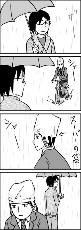 スーパーの袋の新たな使用法 2012年11月12日 21:47 遠くから見たときは、オシャレな帽子に見えたんですが、近くでよく見るとスーパーの袋でした。 カテゴリなしの他の記事 < 前の記事次の記事 > コメント コメント一覧 (6) 1. fubuki 2012年11月13日 03:53 ・・・www[E:sweat01]<br> ・・・www[E:sweat01]<br> すごいな・・・。<br> でも頭が冷えるのが一番よくないっていうから・・・本能??(笑) 0 キヨ がしました 2. なりたり 2012年11月13日 14:33 ウケた!<br> ウケた!<br> セリフがないので、よけいおかしみが(>▽< 0 キヨ がしました 3. 季節 2012年11月13日 17:55 「プッ!何だこれ?!」と…(笑)<br> 「プッ!何だこれ?!」と…(笑)<br> 傘がない代わりに被ったんだろう[E:happy02] 0 キヨ がしました 4. 清 2012年11月13日 22:29 ★fubukiさん★<br> ★fubukiさん★<br> 本能(笑)それなら納得です。<br> 確かにあれなら頭はしっかりガードされてました。<br> <br> <br> ★なりたりさん★<br> こうして漫画にすると、すごくシュールになってしまいました。<br> 実物はもっとシュールでしたけどね。<br> <br> <br> ★季節さん★<br> 私も「何だそれ!」って突っ込んでしまいました。心の中で。<br> どうしても頭は濡らしたくなかったんでしょうねぇ。 0 キヨ がしました 5. 季節 2012年11月21日 17:34 このビニール袋よりも折り畳み傘を<br> このビニール袋よりも折り畳み傘を<br> 持参したら?と言いたくなるもんな~[E:coldsweats01] 0 キヨ がしました 6. 清 2012年11月22日 23:50 ★季節さん★<br> ★季節さん★<br> 確かに(笑)<br> でも、よく頭に丁度良い大きさのビニール袋あったなぁ~って思いました。<br> ジャストフィットしてたんですよ(笑) 0 キヨ がしました コメントフォーム 名前 コメント 記事の評価 リセット リセット 顔 星 情報を記憶 コメントを投稿する