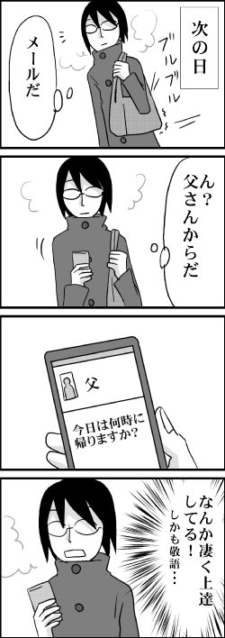 意外なくらい上達 2013年02月06日 22:53 前日までひらがなしか打てなかった父が、今は普通にメール打ってます。 もう少し、面白おかしいメールが欲しかったんだけどなぁ。 (そしてこのブログネタにしようと企んでたのに・・・) カテゴリなしの他の記事 < 前の記事次の記事 > コメント コメント一覧 (2) 1. 真季 2013年02月09日 11:11 お~、何とか慣れたのかな?[E:confident]<br> お~、何とか慣れたのかな?[E:confident]<br> 0 キヨ がしました 2. Unknown 2013年02月09日 23:57 ★真季さん★<br> ★真季さん★<br> 本当に、すごい上達ぶりでビックリしました。<br> おかげさまで、もう慣れたようです[E:eye] 0 キヨ がしました コメントフォーム 名前 コメント 記事の評価 リセット リセット 顔 星 情報を記憶 コメントを投稿する