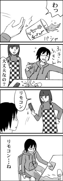 私も不注意で思わぬジュースをこぼしてすぐ拭いてしまう事がありました[E:wobbly]<br>