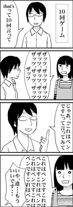 10回ゲーム 2014年05月21日 19:04 『that'sって10回言って』 「that's that's that's that's that's that's that's that's that's that's」 『じゃあ、「これはペンです」って言ってみて』 「This is a pen」 『残念でした~。誰も英語で言えなんて言ってません~』 という流れになるはずだったのに・・・。 カテゴリなしの他の記事 < 前の記事次の記事 > コメント コメント一覧 (11) 1. 真季 2014年05月21日 20:29 10回ゲームかぁ~。面白いんじゃないかしら?[E:...<br> 10回ゲームかぁ~。面白いんじゃないかしら?[E:happy01]<br> 清さん、英語は好きなの?学生時代で好きな学科は何だったのかな…。<br> 0 キヨ がしました 2. なりたり 2014年05月21日 20:34 お母さん、返しが新しい(笑)<br> お母さん、返しが新しい(笑) 0 キヨ がしました 3. 清 2014年05月21日 21:33 ★真季さん★<br> ★真季さん★<br> 10回ゲームなんて久しぶりにやりました。<br> いや、英語は苦手です・・・。勉強は全体的に苦手でした[E:bearing]<br> <br> <br> ★なりたりさん★<br> まさか、こう来るとは思わなかったですね。<br> もっと楽しい10回ゲームがあったら、リベンジしたいと思います。 0 キヨ がしました 4. momo 2014年05月22日 08:27 Youtubeで「レコメン 10回ゲーム」または「関ジャ...<br> Youtubeで「レコメン 10回ゲーム」または「関ジャニ 10回ゲーム」で調べてみてください。(または安田章大 10回ゲーム)<br> 関ジャニ∞のラジオで10回ゲームやってる回があるので。<br> 言えてないので面白いですよ。 0 キヨ がしました 5. 真季 2014年05月22日 09:36 勉強は全体的に苦手ですよねぇ。<br> 勉強は全体的に苦手ですよねぇ。<br> 私もあまり好きではないです[E:sweat01]英語なら覚えやすくて、解る範囲の単語、短い英文<br> くらいはいいと思っていますよ[E:happy01] 0 キヨ がしました 6. まろ 2014年05月22日 21:15 大爆笑[E:happy02]<br> 大爆笑[E:happy02]<br> <br> 相変わらず、お母さん やり手ですね・・ 0 キヨ がしました 7. 清 2014年05月25日 00:39 ★momoさん★<br> ★momoさん★<br> 関ジャニ見ましたよ!that'sのやつもありました(笑)<br> 安田さん、あんなに引っかかって・・・。面白かったです。<br> <br> <br> ★真季さん★<br> 英語がしゃべれる様になったら、格好良いだろうな~っていつも思います。<br> 外人さんとお話してみたいです。<br> <br> <br> ★まろさん★<br> 予想外の展開でしたね。<br> 10回ゲームのルールを知らなかったのかなぁ・・・。<br> 0 キヨ がしました 8. 真季 2014年05月25日 09:15 私は学生時代の時、英語だけ勉強した範囲だけで実...<br> 私は学生時代の時、英語だけ勉強した範囲だけで実際に外人と英会話はした事が<br> ないです。<br> 清さん、スムーズに英会話が出来るといいですね(笑)[E:happy01]<br> 0 キヨ がしました 9. 清 2014年05月25日 21:11 ★真季さん★<br> ★真季さん★<br> 私は外人に道を聞かれたことがありますが、90%日本語で説明してました。<br> ダメダメです。 0 キヨ がしました 10. 愛知の人 2025年04月15日 20:54 声出して笑った。 これだから読み進めるのやめられない。 0 キヨ がしました 11. キヨ 2025年04月16日 17:25 >>10 昔の記事も見てくださって、ありがとうございます。 母との10回ゲーム、面白かったです。 0 キヨ がしました コメントフォーム 名前 コメント 記事の評価 リセット リセット 顔 星 情報を記憶 コメントを投稿する