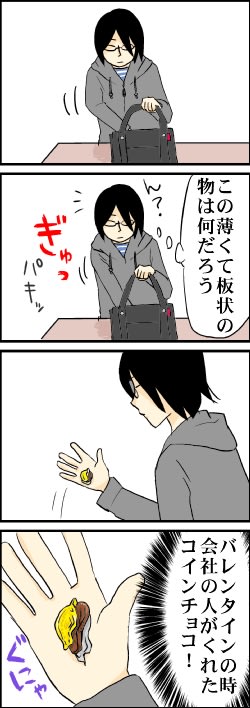 コインチョコ 2015年02月18日 21:01 コインチョコなんて久しぶりに貰って、ウキウキしてたはずなのに、すっかり忘れて握りつぶしちゃいました。 この後、すぐ食べました。 「日記」カテゴリの最新記事 < 前の記事次の記事 > コメント コメント一覧 (10) 1. 真希 2015年02月18日 23:30 Unknown<br> 今まで本命チョコをあげた事はありません?<br> <br> 私は一度も本命チョコで作ってあげた事はなくて…お世話になった人とか従兄弟に義理チョコのみあげていましたね。<br> <br> そう言えば、そのバッグの中にはチョコに付いてた汚れは無かったのかな~? 0 キヨ がしました 2. 夢人 2015年02月19日 13:59 どうして<br> なぜバレンタインの日に女性の清さんがチョコをもらったのか不思議です 0 キヨ がしました 3. 葉月 2015年02月19日 15:28 懐かしいー!<br> コインチョコ懐かしいですね(笑)<br> 私も食べたくなってきました(^ν^)駄菓子屋にありそう!<br> <br> 友チョコなのか本命チョコなのか気になります( ´ ▽ ` )ノキヨハラさんもてもてそう! 0 キヨ がしました 4. なりたり 2015年02月20日 22:33 Unknown<br> 忘れてたお菓子を見つけると、心が躍りますよね。<br> ぐにゃってなってなければ…OTL 清さんカワイソス 0 キヨ がしました 5. 清 2015年02月23日 22:27 Unknown<br> ★真希さん★<br> 今年は課長に義理チョコをあげました。<br> 仕事の一部みたいな義務的なチョコだけど、選んでるときは楽しかったです。<br> <br> カバンの中は汚れなかったけど、手はチョコがついちゃいました。<br> <br> <br> ★夢人さん★<br> 友チョコですね。<br> チョコ苦手な社員さんが分けてくれたのを、私にくれたみたいです。<br> バレンタインはなんだかんだで、自分もチョコを食べられるので嬉しいです。<br> <br> <br> ★葉月さん★<br> コインチョコ、懐かし~。<br> 確かに駄菓子やでよく見かけた気がします。<br> 最近は駄菓子屋自体、ないんですよね~。<br> <br> 友チョコですよー。<br> 全然モテないしなぁ・・・。<br> <br> <br> ★なりたりさん★<br> たまにカバンの底から、お菓子が出てくることありますよね~~。<br> 私が忘れっぽいだけかなぁ。<br> ぐにゃってなっても、食べればおいしいので大丈夫です! 0 キヨ がしました 6. 真希 2015年02月24日 21:40 Unknown<br> 課長に義理チョコをあげたそうですねぇ。<br> 義務的なチョコかぁ~~(笑)<br> 清さんのカバンの中は汚れてなくて良かったな!<br> 昨日か?今日か風邪なのか花粉症なのか?とハッキリ<br> と解らないが、喉の調子が可笑しくて…。今のところ、熱<br> は無いからいいけどね。。。 0 キヨ がしました 7. 清 2015年03月02日 21:45 ★真希さん★<br> 真希さん、体調悪いんですか。<br> 大丈夫でしょうか・・・。<br> そろそろ花粉も飛びはじめるから、心配ですね。 0 キヨ がしました 8. 真希 2015年03月04日 17:21 Unknown<br> 実は、花粉症でした…。<br> どうやら乳酸菌はいいらしいので、乳酸菌入りの紙パックジュースを飲んでいます!<img src="https://blogimg.goo.ne.jp/img_emoji/m_0208.gif"><br> 更に、出来るだけ少しでも和らぎたいので…眼鏡とマスク<br> を掛けています…。<br> 0 キヨ がしました 9. 真希 2015年03月11日 09:07 Unknown<br> …と言っても乳酸菌だけじゃ駄目なのかもね…。<br> せっかく花粉症が和らいでいてもスギと言う花粉はタブー<br> なので再発しやすく、喉の少し違和感、左鼻のみ鼻水、<br> 目がちょっと痒い、くしゃみの繰り返しなので辛いですよ~~<img src="https://blogimg.goo.ne.jp/img_emoji/m_0210.gif"><img src="https://blogimg.goo.ne.jp/img_emoji/m_0156.gif"><br> 0 キヨ がしました 10. 清 2015年03月15日 21:08 ★真希さん★<br> マスクと眼鏡が必要なんですね!<br> けっこう重症っぽい?<br> 私も乳酸菌飲もうかなぁ。<br> <br> そういえば私も左の鼻からよく鼻水でます。<br> 左の鼻の穴だけ異常にかゆいし・・・。<br> 目がかゆいのつらそうですね。早く花粉の時期が終わればいいのに。 0 キヨ がしました コメントフォーム 名前 コメント 記事の評価 リセット リセット 顔 星 情報を記憶 コメントを投稿する