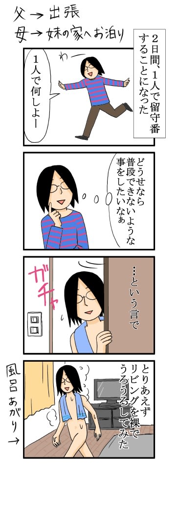 裸でうろうろ 2016年01月13日 21:46 家で2日間も1人で留守番をする機会って滅多にないので、思い切り満喫する方法を考えた結果がこれです。 それにしてもすごい解放感ですね! もし私が一人暮らしをしたら、部屋では裸で暮らしてるんじゃないかと思います。 「日記」カテゴリの最新記事 < 前の記事次の記事 > コメント コメント一覧 (11) 1. なりたり 2016年01月13日 22:56 Unknown<br> いや~ん セクシー(笑)<br> <br> 普段人がいるのが当たり前の実家だったら開放感ありますが、普段自分しかいない1人暮らしのアパートだったら、裸でも何の開放感もないかもですね(笑 0 キヨ がしました 2. 和田ヶゐ 2016年01月13日 23:34 えーっと<br> 寒くないんですか???(@_@) 0 キヨ がしました 3. 那須の小太郎 2016年01月14日 07:49 Unknown<br> たまに一人になると開放感を感じますね(●^o^●)<br> 私は今は常に一人なので、一人が当たり前で<br> なんとも思いませんが(。・_・。)<br> <br> 冬でも北海道は家の中は裸で要られるほど暖かいのでしょうか?<br> 誰か訪問が有ったら慌てませんか(゜д゜)!<img src="https://blogimg.goo.ne.jp/img_emoji/m_0140.gif"> 0 キヨ がしました 4. Yuki 2016年01月14日 21:12 大胆ですね<br> 裸でリビングをうろうろなんて大胆ですね。<br> 私ももうちょっとスタイルが良ければやってみたい…なんて冗談です(笑)。 0 キヨ がしました 5. 清 2016年01月14日 23:40 Unknown<br> ★なりたりさん★<br> 全く持ってセクシーとは無縁な私です。<br> 確かに1人暮らしだったら、裸が当たり前になったとき、解放感はなくなってしまいますね。<br> <br> ★和田ヶゐさん★<br> 部屋が暖かいので、短時間なら大丈夫です。<br> 裸、楽しかったです(笑)<br> <br> ★那須の小太郎さん★<br> う~ん、やっぱり一人暮らしだと、解放感はないですよね。<br> 日中は、ずっとストーブをつけてるので、結構暖かいです。たまに暑いです。<br> 小太郎さんの方は、部屋は寒いのでしょうか・・・。<br> 裸の時に誰か来たら・・・そこまで考えてなかったです。<br> <br> ★Yukiさん★<br> 我ながら大胆でした(笑)<br> でもやっぱり落ち着かなくて、すぐに服を着てしまいました。<br> 普段やらないような事をやると、すごく新鮮な気分になりました。<br> 誰もいないとき、やってみてほしいです。<br> 0 キヨ がしました 6. 真希 2016年01月15日 20:13 Unknown<br> 2日間も1人で留守番をする機会って滅多にないですよね~。<br> 一人暮らしに経験が無い様ですね!<br> 私は4年間くらい一人暮らしに経験しています。<br> 経済的は大変だったのですが、思い寄らない臨時収入が出る時があり、自由で束縛がない感じで幸せでした(笑) 0 キヨ がしました 7. 仲畑 2016年01月18日 00:08 Unknown<br> 裸族ですね(笑)<br> シャンプーとか切らしてコソコソと<br> ストック場までタオル1枚で行ったことはありますが<br> 堂々と行けるなんて、すごい解放感!<br> たまにしか出来ない事だからこそですよね。楽しそう☆<br> でも満喫しすぎて風邪ひかないように(笑)<br> 0 キヨ がしました 8. 敬 2016年01月18日 21:21 なんと!<br> 大胆ですね(笑)<br> <br> 普段できないこと…<br> 昼間からお酒を飲みながら<br> ポテトチップスを一袋食べ切るですかね<br> (ーー;) 0 キヨ がしました 9. 清 2016年01月19日 23:54 Unknown<br> ★真希さん★<br> そう、私にとって滅多にないチャンスなんですね~(笑)<br> 真希さんは一人暮らしの経験があるんですね!<br> やっぱり自由なのっていいですね。<br> <br> ★仲畑さん★<br> 裸族デビューしました。<br> 仲畑さんも、ぜひ試してみてください。<br> とはいえ、やっぱり落ち着かないし、裸だからってやることも特に無かったので、すぐ服着ました(笑)<br> <br> ★敬さん★<br> もうちょっと踏み外したら変態になりそうなので、これくらいにしておこうと思います。<br> 昼間からお酒とポテトチップ!私もやってみたいです。 0 キヨ がしました 10. 真希 2016年01月21日 16:47 Unknown<br> 清さんは一人暮らしに経験がないそうですね<img src="https://blogimg.goo.ne.jp/img_emoji/m_0140.gif"><br> あっ、一人暮らしする予定はありませんか?<br> そう、束縛のない自由なのがいいしね~<img src="https://blogimg.goo.ne.jp/img_emoji/m_0155.gif"><br> 確かに出来れば一人暮らしに戻りたいと思った事があったけど…。 0 キヨ がしました 11. 清 2016年01月21日 22:27 ★真希さん★<br> そうなんですよ、家から通える所に職場があるので、なんとなく実家に住んでます。<br> でもな~一人暮らしって憧れますね。 0 キヨ がしました コメントフォーム 名前 コメント 記事の評価 リセット リセット 顔 星 情報を記憶 コメントを投稿する