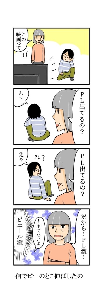 PL 2019年04月11日 16:10 ちなみに観てたのは『忍びの国』でした。 「母」カテゴリの最新記事 < 前の記事次の記事 > コメント コメント一覧 (3) 1. なりたり 2019年04月11日 20:59 Unknown<br> 4コマ目まで予想できなかった(笑 0 キヨ がしました 2. 和田ヶゐ 2019年04月11日 22:46 PL・・・<br> 最後まで見ても、ちょっと考えてしましました(@_@) 0 キヨ がしました 3. 清 2019年04月14日 15:48 Unknown<br> ★なりたりさん★<br> 私もしばらく分からなくて、瀧さんの事だと分かったときはスッキリしました。笑<br> <br> ★和田ヶゐさん★<br> 分かり辛くてすいません 汗<br> 改めて見てみると、よく分からないと思いました。笑<br> 0 キヨ がしました コメントフォーム 名前 コメント 記事の評価 リセット リセット 顔 星 情報を記憶 コメントを投稿する