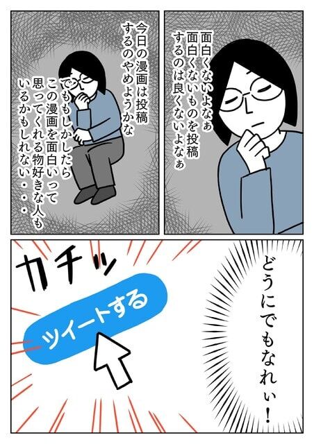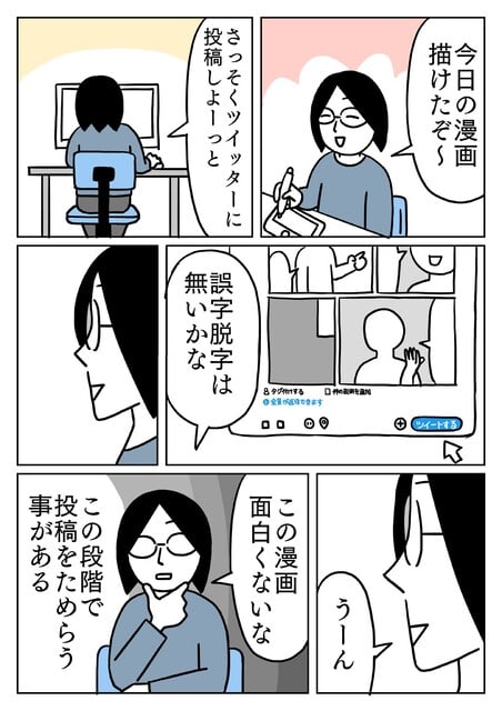 でも投稿しちゃう 2023年02月26日 17:13 急に自分の描いた漫画が面白くなくなる現象 「日記・エッセイ・コラム」カテゴリの最新記事 < 前の記事次の記事 > コメント コメント一覧 (3) 1. 和田ヶゐ 2023年02月28日 19:32 昔から<br> 俺も(@_@)<br> <br> 自分のブログがつまらないんじゃないかと思いながらも・・・<br> <br> 現実面白くないのかもしれないけど<br> <br> まあ、アルバムの外れ曲みたいな感じで<br> <br> そういうのもあっていいかなと思って投稿してます 0 キヨ がしました 2. 清 2023年03月01日 16:48 ★和田ヶゐさん★<br> 皆、同じことを思う瞬間があるんですね。<br> 勇気をもって投稿していこうと思います。 0 キヨ がしました 3. 和田ヶゐ 2023年03月03日 20:09 というか<br> ほぼ外れなので(@_@)<br> <br> まあ、諦めてます!! 0 キヨ がしました コメントフォーム 名前 コメント 記事の評価 リセット リセット 顔 星 情報を記憶 コメントを投稿する