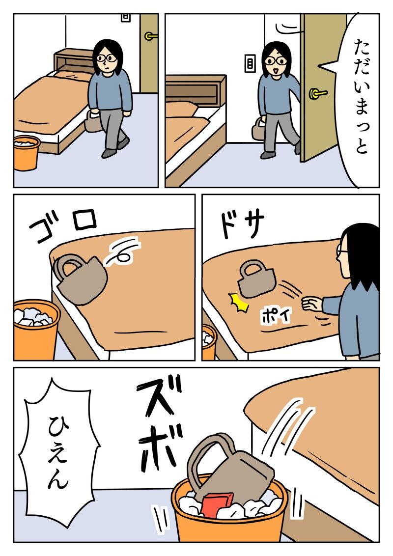 勢いあまって 2025年04月29日 20:00 なにも考えないでベッドにカバンを置いたら、ごみ箱に吸い込まれていきました。↓前にも似たような事がありました↓ 「日常」カテゴリの最新記事 < 前の記事次の記事 > コメント コメント一覧 (2) 1. BB 2025年04月30日 17:56 ベッドだからといって、油断してはいけません。 柔らかい掛け布団の中央あたりにそっと放り投げるのがコツですぞ👜 私もスマホをぽ〜いとやる時、細心の注意をはらってやっています。 0 キヨ がしました 2. キヨ 2025年05月01日 16:45 >>1 油断大敵ですね。 ベッドってなんでもポイポイ置いたりしてるけど、意外と不安定でした。 0 キヨ がしました コメントフォーム 名前 コメント 記事の評価 リセット リセット 顔 星 情報を記憶 コメントを投稿する