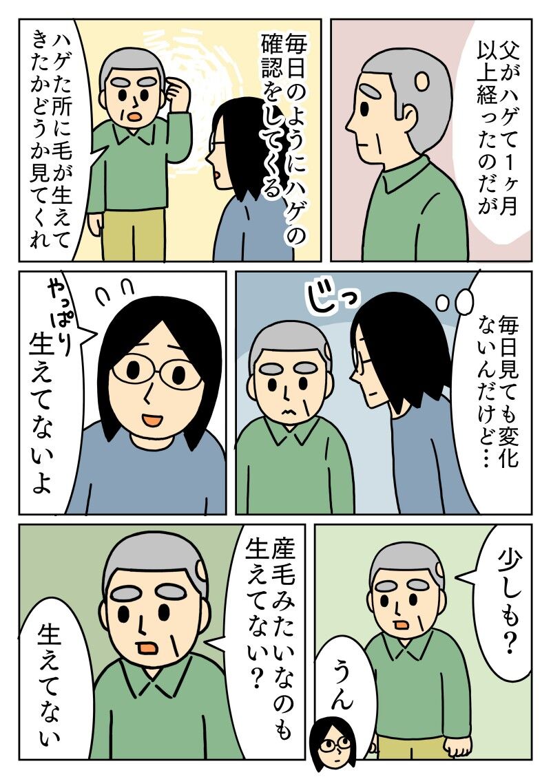 ハゲの確認をする父 2025年07月16日 20:00 しょっちゅう同じやりとりをしてます。笑そしてなぜか、なにも気にしてないような態度をとります。↓前回の記事です↓ 「父」カテゴリの最新記事 < 前の記事次の記事 > コメント コメント一覧 (2) 1. BB 2025年07月17日 15:24 ホントはどうでも良いわけありませんね。 ほんの少しでもうぶ毛だけでも、1本だけでも生えてほしいハゲ心、、、 涙が出てしまいます😢 頑張って〜、お父さん🥺 0 キヨ がしました 2. キヨ 2025年07月17日 17:17 >>1 そうなんです。 多分やせ我慢です。笑 早く髪が生えてくるよう、私も願ってます。 0 キヨ がしました コメントフォーム 名前 コメント 記事の評価 リセット リセット 顔 星 情報を記憶 コメントを投稿する