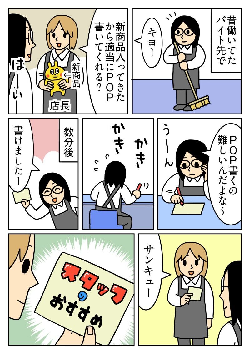 POPを描く 2025年10月19日 20:00 店長もなにも言わず書かせてくれました。笑↓こちらから色々見れます↓ 「昔のはなし」カテゴリの最新記事 < 前の記事次の記事 > コメント コメント一覧 (5) 1. BB 2025年10月19日 20:10 いいんだよ、ドンキだって、誰かのをパクってるかもなんだから。 ていうか、皆,人の見てだいたいやってるんじゃないの? 一番初めにやり始めた人誰なのか,誰も知らないしさ。 自分が一番はじめに考えたと思ってる人も、前にチラッと見たのを思い出してる可能性大ありなんだって。 気にしない,気にしない😆 0 キヨ がしました 2. キヨ 2025年10月20日 16:02 >>1 確かにこの世に似たようなものってたくさん溢れてますよね。 私もドンキのフォントが好きなので、ちょっと参考にさせて頂きました。笑 0 キヨ がしました 3. BB 2025年10月20日 19:04 あのレベルなら、思い付く人はいっぱいいるんじゃないかな? 0 キヨ がしました 4. あい 2025年10月21日 21:38 ビレヴァン風でもある🤭 0 キヨ がしました 5. キヨ 2025年10月22日 16:28 >>4 ヴィレヴァンのPOPもセンスあって良いですよね。 憧れます 0 キヨ がしました コメントフォーム 名前 コメント 記事の評価 リセット リセット 顔 星 情報を記憶 コメントを投稿する